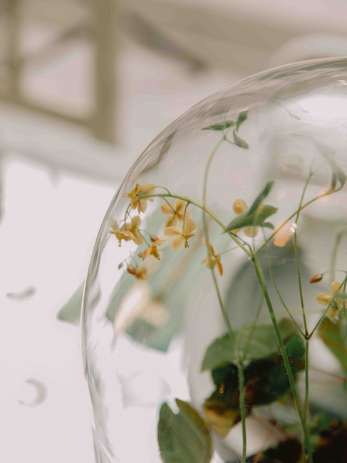 Between them, glass vessels: light, almost like soap bubbles.
