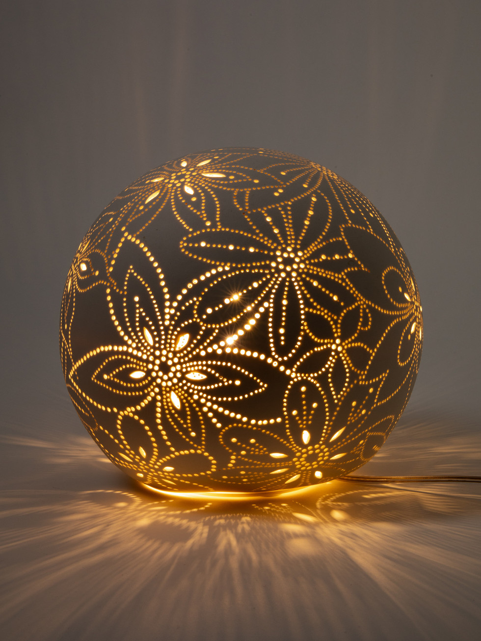 Our MOONSTRUCK table lamps transform a room into a softly illuminated atmosphere. When paired with a clear bulb, the delicate floral perforations cast enchanting patterns across walls and ceilings, creating a subtle, immersive glow. The lamps are available in three sizes: small, medium, and large, allowing them to be used individually or combined to create a layered lighting display.